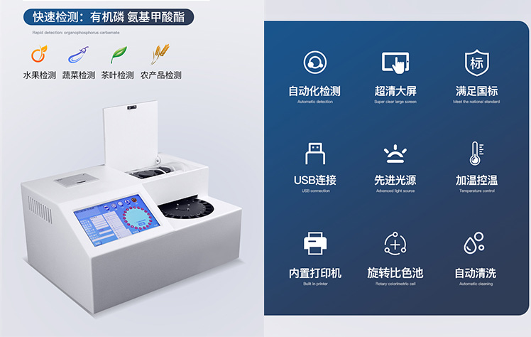 云唐全自動(dòng)農(nóng)藥殘留檢測儀YT-NY2000,檢測標(biāo)準(zhǔn):依據(jù)****方法(GB/T5009.199-2003)以及世界衛(wèi)生組織WHO、世界糧農(nóng)組織FAO殘留農(nóng)藥檢測標(biāo)準(zhǔn)、世界環(huán)境保護(hù)局EPA參照攝入量等要求來設(shè)計(jì)。采用酶抑制率比色法對(duì)水果、蔬菜等農(nóng)林產(chǎn)品中有機(jī)磷和氨基甲酸酯類農(nóng)藥含量進(jìn)行快速準(zhǔn)確的檢測。