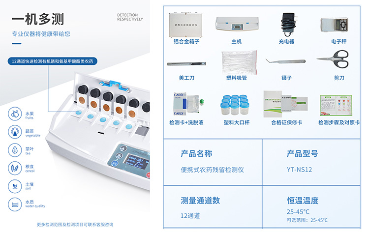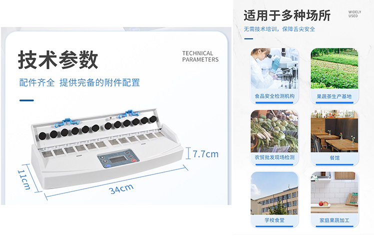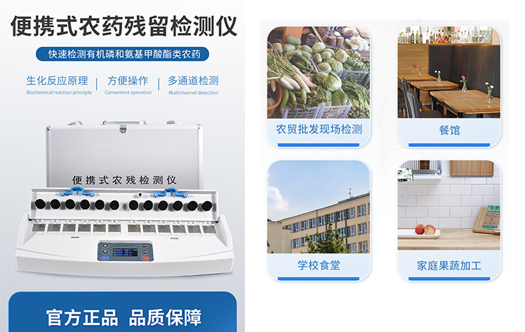 主要用于水果、蔬菜、茶葉、糧食、水及土壤中有機磷和氨基甲酸酯類農藥的快速檢測,特別適用于各級食品安全檢測機構現場執法使用,此外還可用于果蔬茶生產基地和農貿批發銷售市場現場檢測,餐館、食堂、家庭果蔬加工前的安全速測等