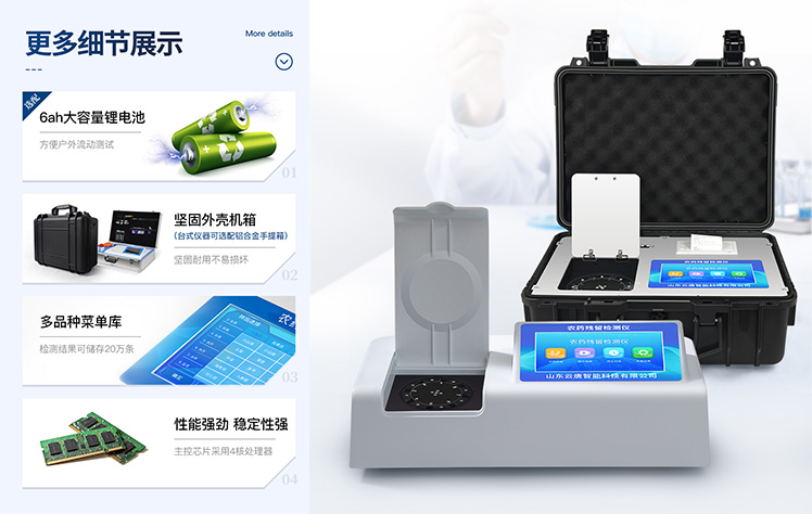 | 機器采用全新安卓智能系統,主控芯片采用 ARM Cortex-A7,RK3288/4核處理器,主頻1.88Ghz,運轉速度更快速,穩定性更強。 | 創新檢測模式: *儀器采用精密旋轉比色池設計,使用光源一致,可以解決各通道間由于光源誤差帶來的檢測結果誤差問題,檢測結果更加精準。 *儀器具有自動識別比色皿檢測功能,即:將樣品比色皿放入儀器后,點擊樣品檢測,儀器自動識別比色皿進行通道檢測。 | 供電方式:交直流兩用,直流 12V 供電,可連接車載電源,可配 6ah 大容量充電鋰電池,方便戶外流動測試。 | 顯示方式:7英寸液晶觸摸屏顯示,人性化中文操作界面,讀數直觀、簡單。 | 檢測通道:8個檢測通道,可以同時測試多個樣品,循環檢測,即放即檢,每個樣品由程序控制分別獨立工作,不會互相干擾。 | 高精光源系統: ①①儀器光源采用進口超高亮發光二極管,光源亮度可以自動調節與校準 ②智能恒流穩壓,光強自動校準,長時間連續工作光源無溫漂現象。 | 智能操作分析系統: ①儀器具有100多種蔬菜名稱菜單庫,分類管理,并可按需添加或刪除、編輯蔬菜名稱;可在同一檢測界面自動對應相關檢測通道一次性選擇1-24個樣品名稱,無需退出界面,節省操作時間。 ②內置新國家限量標準,與所測結果進行現場比對,并持續更新標準。 | 完善的配套硬件: ①采用串口5v打印機,可選擇手動打印或者自動打印,三分鐘出打印結果,打印格式為檢測人姓名、吸光度差值、檢測時間、檢測機構、樣品名稱及結果判定。 ②儀器具有無線上傳模塊,檢測結果可批量打印,批量上傳。 | 數據調用: ①儀器可存儲20萬條檢測結果, ②檢測結果為Excel表格,方便后期進行數據分析與匯總報告 ③儀器采用USB2.0接口設計,支持 U 盤存儲,方便數據的存貯和移動,并可隨時與計算機直接相連,實現數據查詢、瀏覽、分析、統計、打印等。 | 后期產品固件可升級。 | 安全證書,放心保障:儀器具有中國計量科學研究院校準證書,權威認證,使用放心。 |