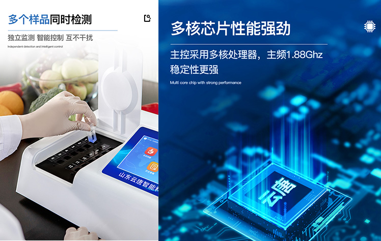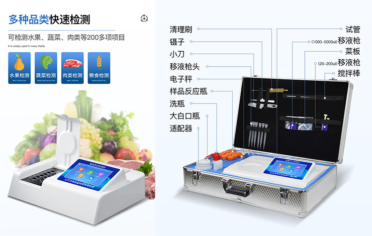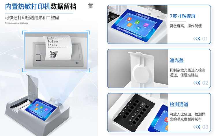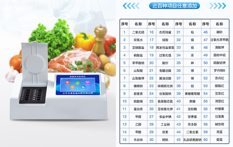 | 安卓智能操作系統(tǒng),采用更加**和人性化操作,儀器具有網(wǎng)線連接、wifi聯(lián)網(wǎng)上傳、GPRS無線遠(yuǎn)傳功能,快速上傳數(shù)據(jù)。 | 智能化程度高,儀器具有自檢功能:具有開機(jī)自檢和調(diào)零功能,具有自動檢測重復(fù)性功能。 | 檢測通道:≥12個檢測通道,可以同時測試多個樣品,每個樣品由程序控制分別獨立工作,不會互相干擾。 | 顯示方式:≥8英寸液晶觸摸屏顯示,人性化中文操作界面,讀數(shù)直觀、簡單。 | 配備新一代嵌入式熱敏打印機(jī),可選擇手動打印或者自動打印,檢測完成可自動打印檢測報告和二維碼。 | 光源采用進(jìn)口超高亮發(fā)光二極管,高精度、穩(wěn)定性強(qiáng)、光源可控、可以關(guān)掉不使用的光源,功耗更低。 | 采用USB2.0接口設(shè)計,方便數(shù)據(jù)的存貯和移動,并可隨時與計算機(jī)直接相連,并且可用計算機(jī)控制儀器。實現(xiàn)數(shù)據(jù)查詢、瀏覽、分析、統(tǒng)計、打印等。 | 儀器帶有監(jiān)管平臺。數(shù)據(jù)可局域網(wǎng)和互聯(lián)網(wǎng)數(shù)據(jù)上傳,檢測結(jié)果直接傳至食品安全監(jiān)管平臺。進(jìn)行區(qū)域食品安全監(jiān)管及大數(shù)據(jù)分析處理,檢測區(qū)域食品安全長短期動態(tài),達(dá)到食品安全問題預(yù)估、預(yù)警 | 一體化便攜式快檢設(shè)備,滿足現(xiàn)場及流動檢測使用需求,能夠在同一軟件下實現(xiàn)所有檢測項目的檢測,并可通過同一窗口直觀顯示檢測結(jié)果。 | 儀器具有多品類多種類樣品菜單庫,可靈活選擇檢測樣品,不同的檢測通道可同時檢測不同的樣品項目。也可在儀器上直接編輯錄入樣品名稱、檢測指標(biāo)、送檢單位等信息并保存進(jìn)樣品數(shù)據(jù)庫。 | 樣品處理簡單省力,整體操作快速、安全、便捷。 | 儀器具有自身保護(hù)功能,可設(shè)置用戶名及密碼,防止非工作人員操作等。 | 高靈敏度,高檢測精度,高重復(fù)性精度,掃描式高精度光學(xué)傳感器。 | 內(nèi)置強(qiáng)大的數(shù)據(jù)庫,可在儀器上直接選擇樣品名稱、檢測指標(biāo)、送檢單位等信息,也可在儀器上直接編輯錄入樣品名稱、檢測指標(biāo)、送檢單位等信息并保存進(jìn)樣品數(shù)據(jù)庫。 | 儀器具有重新校準(zhǔn)、鎖定、恢復(fù)出廠設(shè)置功能。 | 支持U盤存儲。 結(jié)果判定線可修改,對照值標(biāo)定值可保存,斷電不丟失數(shù)據(jù)。 |