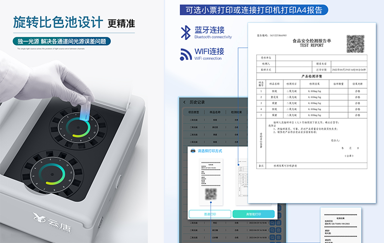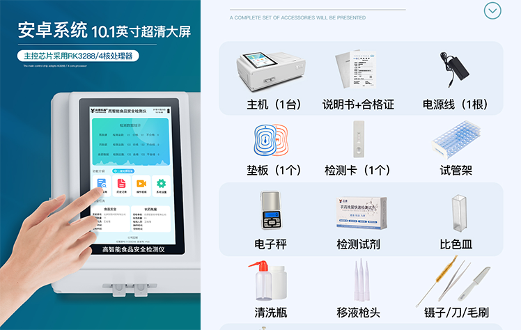 | 儀器采用臺(tái)式一體化系統(tǒng)檢測(cè)技術(shù),將分光光度模塊、膠體金檢測(cè)模塊、新型農(nóng)殘檢測(cè)模塊、數(shù)字化管理模塊、無(wú)線通訊模塊高度集成于一體,支持檢測(cè)200種食品安全檢測(cè)項(xiàng)目,同時(shí)預(yù)留升級(jí)檢測(cè)方法。 | 儀器檢測(cè)模塊標(biāo)準(zhǔn)化、智能化,可隨意自由組合。檢測(cè)箱體內(nèi)置多個(gè)標(biāo)準(zhǔn)檢測(cè)單元,檢測(cè)模塊可以調(diào)整配置。 | 儀器采用全新安卓智能系統(tǒng),主控芯片采用 ARM Cortex-A7,RK3288/4核處理器,10.1寸高清液晶觸摸豎屏,更加**的UI交互界面,運(yùn)轉(zhuǎn)快捷;儀器配備無(wú)線通信模塊: 4G(APN)通訊模塊、Wifi模塊,藍(lán)牙傳輸,同時(shí)具有雙USB接口以及RJ45接口能以多種方式實(shí)現(xiàn)數(shù)據(jù)保存和數(shù)據(jù)傳輸功能。 | 創(chuàng)新檢測(cè)模式★檢測(cè)通道:≥12通道;采用精密旋轉(zhuǎn)比色池設(shè)計(jì),使用同芯片同光源校準(zhǔn)精度,解決不同光源之間的誤差值。1-12通道間誤差0.1%。(***:ZL202022821055.2) ★儀器具有自動(dòng)識(shí)別比色皿檢測(cè)功能,即:將樣品比色皿放入儀器后,點(diǎn)擊樣品檢測(cè),儀器自動(dòng)識(shí)別比色皿進(jìn)行通道檢測(cè)。 | 進(jìn)口高精光源:高精度進(jìn)口四波長(zhǎng)冷光源,通道配置 410、520、590、630nm 波長(zhǎng)光源,一個(gè)光源芯片驅(qū)動(dòng)一個(gè)光源,誤差極小,每臺(tái)設(shè)備單獨(dú)**校準(zhǔn)光源,**比對(duì),同時(shí)參照四種不同波段光源全方位覆蓋市面上99%的農(nóng)殘食品項(xiàng)目檢測(cè)。 | 膠體金模塊檢測(cè)方式:★采用COMS實(shí)時(shí)成像技術(shù),可采集多個(gè)畫(huà)面,支持2個(gè)金標(biāo)同時(shí)讀卡,通過(guò)不同顏色的灰度變化,一秒精準(zhǔn)得出結(jié)果。 | 智能操作分析系統(tǒng): | ★便捷操作系統(tǒng):設(shè)備檢測(cè)時(shí)可在同一檢測(cè)界面自動(dòng)對(duì)應(yīng)相關(guān)檢測(cè)通道一次性選擇1-12個(gè)樣品名稱(chēng),無(wú)須退出界面,節(jié)省操作時(shí)間。(需提供對(duì)應(yīng)證明) | ★數(shù)據(jù)集成系統(tǒng):設(shè)備首頁(yè)自動(dòng)統(tǒng)計(jì)檢測(cè)數(shù)據(jù)包含:周檢測(cè)數(shù)據(jù)、月檢測(cè)數(shù)據(jù),全部檢測(cè)總數(shù)量,均包含檢測(cè)總數(shù),合格數(shù),不合格數(shù),以及相關(guān)柱形分析圖,對(duì)各項(xiàng)檢測(cè)數(shù)據(jù)清晰掌握,無(wú)需電腦查詢(xún),更加快捷直觀。(需提供對(duì)應(yīng)證明文件) | ★項(xiàng)目預(yù)設(shè)系統(tǒng):支持添加單個(gè)及多個(gè)相同或不相同的任務(wù)預(yù)設(shè),一鍵快速調(diào)取,每一個(gè)任務(wù)分別可以設(shè)置不同的樣品、批次、編號(hào)、來(lái)源、備注、抽樣信息、檢測(cè)信息、受檢信息、復(fù)核信息等更多信息。無(wú)縫鏈接平臺(tái)和APP實(shí)時(shí)查看下發(fā)任務(wù)。(需提供對(duì)應(yīng)證明文件) | ★數(shù)據(jù)監(jiān)管系統(tǒng):同步對(duì)接監(jiān)管平臺(tái),數(shù)據(jù)可局域網(wǎng)和互聯(lián)網(wǎng)數(shù)據(jù)上傳,檢測(cè)結(jié)果可選擇直接傳至食品安全監(jiān)管平臺(tái)。集成OSS輸出存儲(chǔ)服務(wù)、區(qū)分設(shè)備定向管理應(yīng)用,進(jìn)行區(qū)域食品安全監(jiān)管及大數(shù)據(jù)分析處理與數(shù)據(jù)統(tǒng)計(jì),檢測(cè)區(qū)域食品安全長(zhǎng)短期動(dòng)態(tài),達(dá)到食品安全問(wèn)題預(yù)估、預(yù)警。(需提供對(duì)應(yīng)食品理化分析系統(tǒng)計(jì)算機(jī)軟件著作權(quán))。 | ★ 自定義打印系統(tǒng):內(nèi)置全新打印系統(tǒng),新創(chuàng)自定義打印方式,可按需靈活設(shè)置開(kāi)啟或關(guān)閉:產(chǎn)品合格證(國(guó)家農(nóng)業(yè)部標(biāo)準(zhǔn)要求),二維碼,抽樣信息、檢測(cè)信息,受檢信息、復(fù)核信息、抽樣日期、檢測(cè)日期等信息的打印。(需提供對(duì)應(yīng)證明) | ★系統(tǒng)遠(yuǎn)程更新功能:可定向分客戶(hù)分儀器更新系統(tǒng),按照不同客戶(hù)后期實(shí)際需求添加項(xiàng)目,無(wú)需機(jī)器返廠,即可遠(yuǎn)程實(shí)時(shí)升級(jí)全新系統(tǒng),節(jié)省時(shí)間成本及避免運(yùn)輸造成設(shè)備損壞。 | 儀器主機(jī)采用一體化防水、抗壓、防撞擊、防腐蝕箱體設(shè)計(jì),同時(shí)配備交直流供電,可連接車(chē)載電源,可選配大容量充電鋰電池,滿(mǎn)足現(xiàn)場(chǎng)野外檢測(cè)需求。 | 安全證書(shū),放心保障:儀器具有中國(guó)計(jì)量科學(xué)研究院校準(zhǔn)證書(shū),權(quán)威認(rèn)證。 |