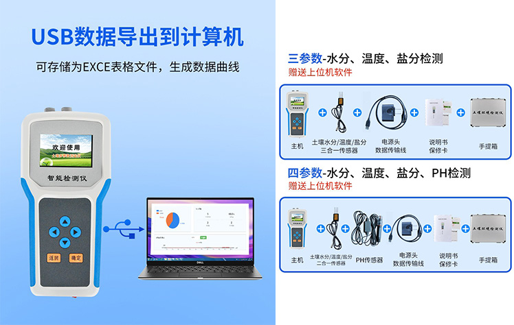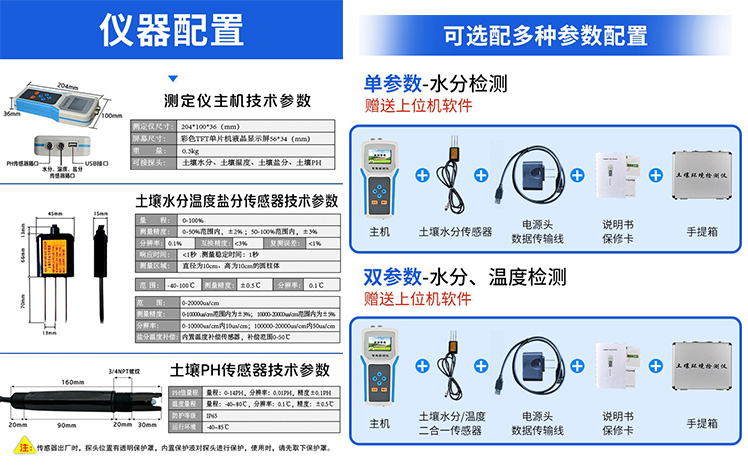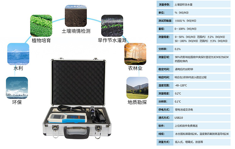 | 測量參數:土壤容積含水量; 單位:%(m3/m3); 測試靈敏度:±0.01 %(m3/m3); | 量程:0-100%(m3/m3) 測量精度:0-50%(m3/m3)范圍內)±2%(m3/m3); | 50-100%(m3/m3)范圍內)±3%(m3/m3); 分辨率:0.1% | 土壤溫度范圍:-40-120℃ 測量精度:±0.2℃ 分辨率:±0.1℃ | 土壤鹽分范圍:0-20ms 測量精度:±2% 分辨率:±0.1ms | PH測量范圍:0-14 分辨率:0.1 測量精度:±0.2% | 集成電極:土壤水分,土壤溫度,土壤鹽分三合一,集成到一個傳感器; | ph復合電極:電極為復合電極,自動溫度補償,測試更穩定更準確。 | 儀器尺寸:10×21×3.5cm | 供電方式:鋰電池供電、交流電兩種方式 | 軟件:上位機軟件免費贈送 |