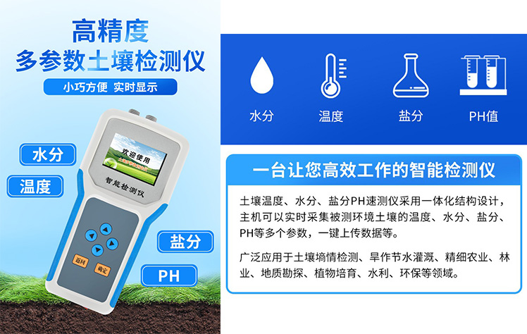 土壤水分溫度鹽分PH測定儀采用一體化結構設計,可快速準確測量土壤中含水量、溫度、電導率(鹽分)、酸堿度,可對多處樣地、不同土壤深度的水分含量溫度鹽分和PH進行快速檢測和長期連續監測。廣泛應用于土壤墑情檢測、旱作節水灌溉、精細農業、林業、地質勘探、植物培育、水利、環保等領域。