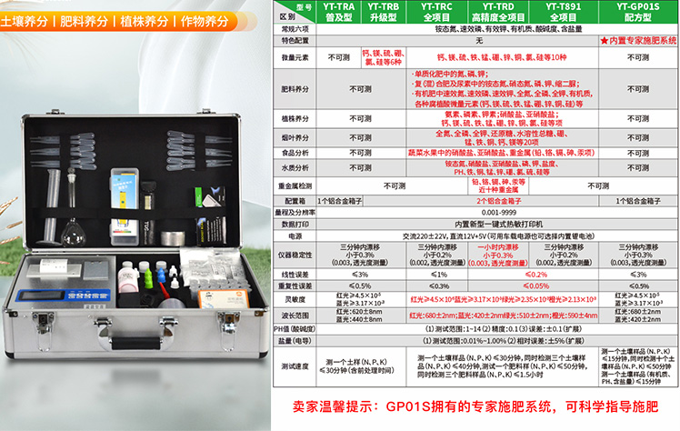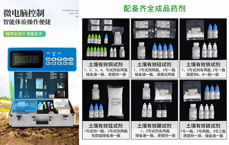 | 《機(jī)箱/藥劑一體式鋁合金機(jī)箱》設(shè)計(jì),便于攜帶、堅(jiān)固耐用,配套成品藥劑。 | 微電腦控制,數(shù)字化線路、程序化設(shè)計(jì),液晶顯示,交直流兩用,可野外流動(dòng)測(cè)試,大程度降低操作者的失誤和勞動(dòng)強(qiáng)度。 | 分辨率:0.001,觸摸式按鍵,內(nèi)置熱敏打印機(jī),可打印測(cè)試結(jié)果。 | 可檢測(cè)土壤及化肥、有機(jī)肥、植株中的速效氮、有效磷、速效鉀、全氮、全磷、全鉀、有機(jī)質(zhì)含量,土壤酸堿度,含鹽量(擴(kuò)展)。 | 土壤養(yǎng)分速測(cè)儀采用高亮度 LED 燈作為光源, 硅半導(dǎo)體作為信號(hào)接收系統(tǒng), 壽命長達(dá)10萬小時(shí)級(jí)別。光源穩(wěn)定,一致性好。 | 比色槽部分采用單通道、雙光路設(shè)計(jì),無機(jī)械位移及磨損,光路測(cè)試定位**,保證測(cè)定結(jié)果精度。 |