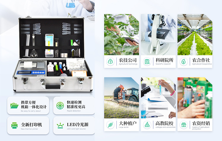 | 土壤養(yǎng)分:● 銨態(tài)氮、速效磷、速效鉀、水份、有機(jī)質(zhì)、酸堿度(pH試紙法)等項(xiàng); | 肥料養(yǎng)分:● 單質(zhì)化肥中的氮、磷、鉀; ● 復(fù)(混)合肥及尿素中的銨態(tài)氮、磷、鉀; ● 有機(jī)肥中速效氮、速效磷、速效鉀、全氮、全磷、全鉀、pH、有機(jī)質(zhì)等。 |
