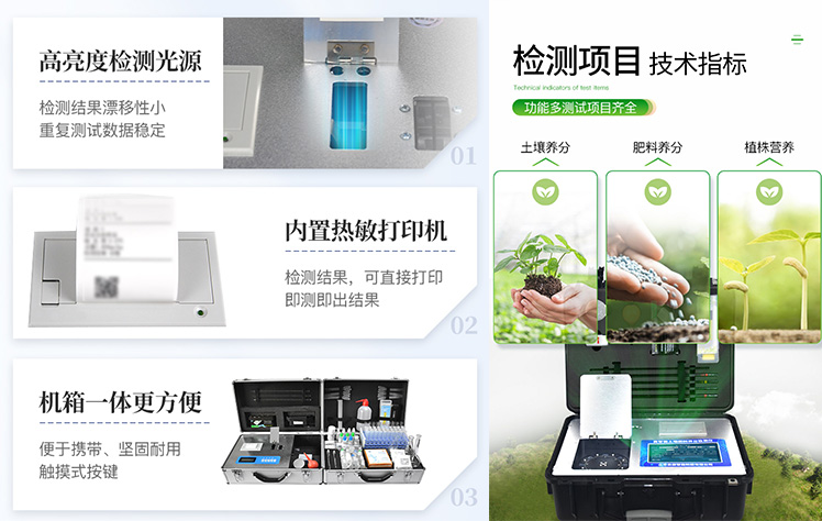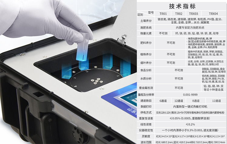 | 土壤養分:●土壤銨態氮、土壤有效磷、土壤速效鉀、土壤硝態氮、土壤堿解氮、土壤全氮、土壤全磷、土壤全鉀、土壤有機質(丘林法)、土壤有機質(浸提法)、PH值、含鹽量、水分。●土壤中微量元素:土壤鈣、土壤鎂、土壤硫、土壤硅、土壤硼、土壤鐵、土壤銅、土壤錳、土壤鋅、土壤氯;●土壤重金屬:土壤鉛、土壤砷、土壤鎘、土壤鉻、土壤汞。 | 環境:土壤濕度、土壤溫度、土壤電導率、空氣溫度、空氣濕度、露點、大氣壓力、光照度、二氧化碳; | 肥料養分:●單質肥:氮肥中銨態氮、肥料硝態氮、尿素氮、縮二脲、磷肥中磷、磷肥中水溶性磷、鉀肥中鉀;●復合肥全氮、復合肥全磷、復合肥全鉀;●有機肥全氮、有機肥全磷、有機肥全鉀、有機肥硝態氮、有機肥速效磷、有機肥速效鉀、有機肥酸解氮、有機質;●水溶性腐植酸(風化煤)、水溶性腐植酸(褐煤)、水溶性腐植酸(泥炭)、游離態腐植酸(風化煤)、游離態腐植酸(褐煤)、游離態腐植酸(泥炭);●水溶肥全氮、水溶肥全磷、水溶肥全鉀;●葉面肥全氮、葉面肥全磷、葉面肥全鉀;●各種肥料微量元素:肥料鈣、肥料鎂、肥料硫、肥料硅、肥料硼、肥料鐵、肥料銅、肥料錳、肥料鋅、肥料氯;●肥料重金屬:肥料鉛、肥料砷、肥料鎘、肥料鉻、肥料汞。 | 鮮作物營養:●作物硝態氮、作物銨態氮、作物磷、作物鉀;●作物中微量元素:作物鈣、作物鎂、作物硫、作物硅、作物硼、作物鐵、作物銅、作物錳、作物鋅、作物氯;●作物中硝酸鹽、亞硝酸鹽、總糖量、還原糖、蛋白質。 | 干植株營養:●植株全氮、植株全磷、全鉀、植株中微量元素:植株全鈣、植株全鎂、植株全硫、植株全鐵、植株全錳、植株全硼、植株全鋅、植株全銅、植株全氯、植株全硅。 | 煙葉營養:●全氮、全磷、全鉀、還原糖、水溶性總糖、硼、錳、鐵、銅、鈣、鎂等20項。 | 食品(水果、蔬菜等):●農藥殘留、硝酸鹽、亞硝酸鹽、鉛、砷、鎘、鉻、汞、銅、鋁、二氧化硫、雙氧水、苯甲酸鈉、山梨酸、糖精鈉、甜蜜素、硫酸鎂、甲醛、吊白塊、硼砂、溴酸鉀、總酸、色素、蛋白質、葡萄糖、淀粉酶等項。 | 水質中:COD、氨氮、總磷、總氮、余氯、溶解氧、二氧化氯、水中氰化物;重金屬鉛、砷、鎘、鉻、汞;水中硝酸鹽、亞硝酸鹽、硬度、PH、鐵、銅、錳、鋅、鋁、硼、氯、硫、硅等 |