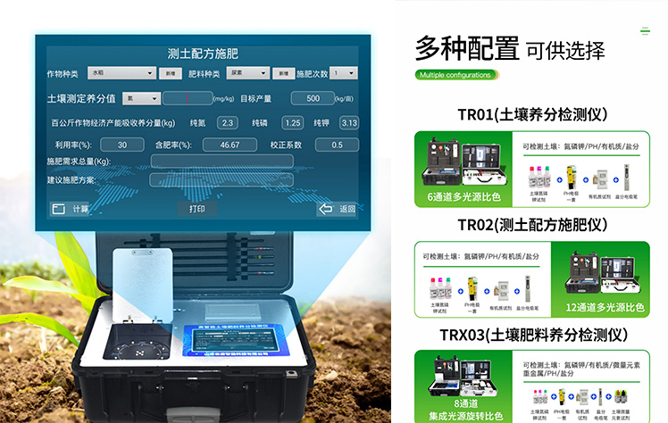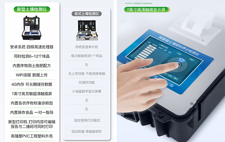 | 安卓智能操作系統Android 7.1版本,主控芯片采用ARM Cortex-A7,RK3288/4核處理器,主頻1.88Ghz,運轉速度更快速,穩定性更強。 | 可檢測各種土壤、肥料、作物、食品、水質、環境等共200多個測試項目,一機多用,功能齊全。 | 測試速度更快!無需空白對照和標準校準,省卻以往繁瑣的操作步驟,一鍵式操作,直接讀取數據,**率,低消耗。 | 12個旋轉檢測通道,一次性可快速檢測12個樣品,極大提升檢測效率,降低檢測成本。 | 采用高精度濾光片技術自主專利分析方法(***:ZL 2020 2 1763837.9),權威認證。 | 具有自身保護功能,內置人臉識別攝像頭可掃臉登錄,也可設置用戶名和密碼,防止非工作人員操作查看實驗數據。 | 檢測過程中內置校準功能,智能恒流穩壓,光強自動校準,確保檢測準確度,取得中國計量科學研究院的《校準證書》 | 內置傳感器航空接口,插拔方便,配備FDR傳感器、環境多要素傳感器。 | FDR傳感器為土壤三參數一體式,可同時測量土壤水分含量、土壤環境溫度、土壤電導率(鹽分)方便快捷。 | 環境多要素傳感器為6要素一體式,可同時測量空氣溫度、空氣濕度、露點、大氣壓力、光照度、二氧化碳。 | 儀器標配wifi無線上傳、4G聯網傳輸、GPRS無線遠傳,快速上傳數據。 | 配有智慧云農業平臺,儀器連入無線網絡后,可將檢測數據可選擇性或批量無線上傳,方便用戶進行數據管理和長期分析。 | 儀器配同時具有USB接口、以太網接口,內置大容量內存,并可隨時用U盤拷貝數據。 | 可用手機隨時登錄云平臺在線移動查看歷史數據 | 內置作物專家施肥系統,可對百余種全國農業經濟作物、果樹等的目標產量計算推薦施肥量,依據施肥配方科學指導農業生產。測土配方施肥結果可打印,打印內容包含:作物種類、肥料種類、目標產量、需求總量、建議施肥方案。 | 內置植物營養診斷標準圖譜,根據各農作物營養缺失的圖片,進行葉面對比,診斷豐缺。 | 4波長專業測試冷光源(紅、藍、綠、橙),光源波長穩定,長時間連續工作光源無溫漂現象,壽命長達10萬小時級別,重現性好,準確度高。 | 比色池部分采用標準1cm比色皿,無機械位移及磨損,光路測試定位**,有效屏蔽外光干擾,保證檢測結果優于國標要求。 | 儀器系統內帶有樣品前處理操作視頻,各種樣品檢測方法點擊視頻模塊即可觀看,檢測人員無需自學說明書,指導教學方便快速,方便新手快速操作。 | 內置新一代高速熱敏打印機(無需色帶),打印內容包含:檢測單位、檢測人員、檢測項目、通道號、吸光度、養分含量(mg/kg)、檢測時間、以及二維碼等信息 | 高靈敏7寸真彩觸摸屏,采用更加**和人性化操作,高清晰高交互顯示,大程度降低傳統儀器的繁瑣操作和失誤,并取得多項《軟件著作權》。 | 內置時鐘功能,方便操作時間記錄,長期歷史追溯。 | 可設置多賬戶賬號密碼登錄,**UI交互界面,不同的用戶可自由添加編輯檢測信息,保存后可長期使用。 | GPS功能:可在野外作業時記錄經緯度地點,滿足特殊用戶需求。 | 內置低電壓提示功能,可在檢測時明確電量,避免測試數據偏移,同時具有斷電保護功能,斷電自動保存數據,防止數據丟失。 | 交直流兩用供電方式,內置大容量充電鋰電池,滿電狀態下可連續工作10余小時,同時可外接車載電源蓄電 | 儀器具有中英文切換功能,可滿足出口要求。 | 高強度PVC工程塑料手提箱設計,堅固耐用,便于攜帶。 |