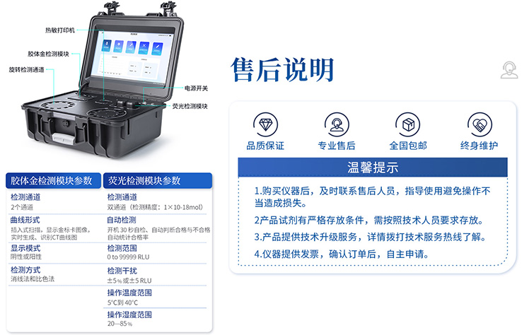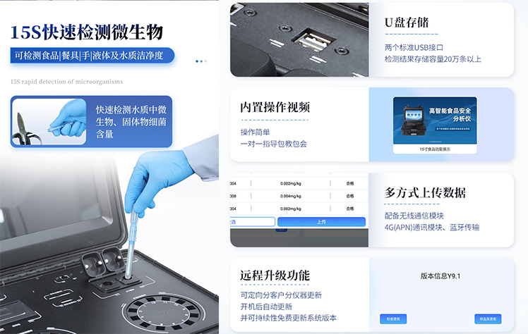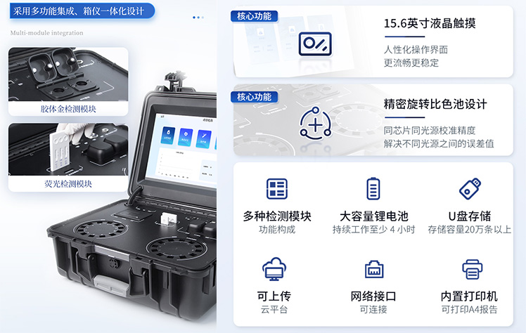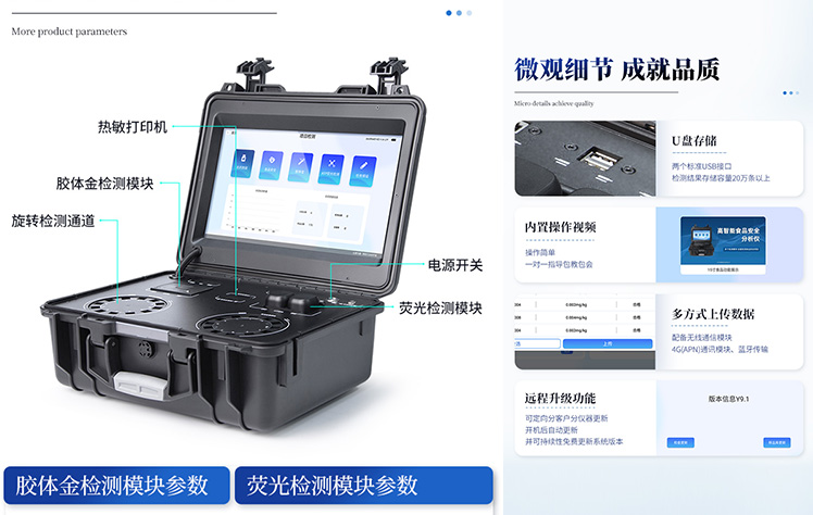 | 1. 功能構(gòu)成:主要包括分光光度模塊、新型農(nóng)殘檢測模塊、膠體金檢測模塊、熒光檢測模塊、數(shù)字化管理模塊等,所有模塊集成一體,可快速檢測200多種食品安全項(xiàng)目,如獸藥殘留、農(nóng)藥殘留、非法添加劑、細(xì)菌數(shù)值等指標(biāo)。 | 2. 檢測樣品種類:餐具及廚房用品、瓜果蔬菜及其制品、水產(chǎn)品及其制品、畜禽產(chǎn)品及其制品、嬰幼兒乳品及奶粉制品、蜂蜜、糧油及其制品、調(diào)味品(食醋、醬油、味精、鹽等)、酒類茶葉及其制品、食用菌、飲料、蛋類藥物殘留(雞蛋,鴨蛋等)、米豆面制品、糖果糕點(diǎn)類(小食品)、薯類及膨化食品、瓶(桶)裝飲用水、添加食用色素的食品、使用添加劑的食品、含有有毒有害物質(zhì)的相關(guān)食品。 | 3、顯示屏幕:儀器采用15.6英寸液晶觸摸屏顯,搭配運(yùn)行安卓智能操作系統(tǒng),主控芯片采用ARM Cortex-A7,RK3288/4核處理器,主頻1.88Ghz,操作方便,性能更強(qiáng)。 | 4、供電模式:儀器交直流兩用,直流12V供電,可連接車載電源,配18ah大容量充電鋰電池,電量可實(shí)時顯示,無外部電源條件下可持續(xù)工作至少 4 小時。 | 5、檢測通道:≥24通道;采用精密旋轉(zhuǎn)比色池設(shè)計,使用同芯片同光源校準(zhǔn)精度,解決不同光源之間的誤差值,更加準(zhǔn)確**,采用高精度進(jìn)口四波長冷光源,每個通道均配置 410、520、590、630nm 波長光源,標(biāo)配**的光路切換裝置,專利光路切換功能可實(shí)現(xiàn)64波長,并且所有檢測項(xiàng)目可實(shí)現(xiàn)所有通道同時檢測. | 6、通訊接口:配備無線通信模塊、4G(APN)通訊模塊、藍(lán)牙傳輸,同時具有雙USB接口以及RJ45網(wǎng)線接口,可以多方式實(shí)現(xiàn)數(shù)據(jù)保存及數(shù)據(jù)傳輸。 | 7、存儲方式:支持U盤存儲,兩個標(biāo)準(zhǔn)USB接口,免驅(qū)動安裝。檢測結(jié)果存儲容量20萬條以上,可生成Excel表格進(jìn)行拷貝,并具有登錄保護(hù)功能。 | 8、操作系統(tǒng):儀器可在同一檢測界面自動對應(yīng)相關(guān)檢測通道,一次性選擇不少于11個樣品名稱,無需退出界面,節(jié)省操作時間。并可以對每個通道屬性和樣品信息單獨(dú)進(jìn)行編輯,例如送檢單位、人員,檢測人員等,打印時勾選打印顯示。 | 9、數(shù)據(jù)集成系統(tǒng):設(shè)備首頁自動匯總分析檢測數(shù)據(jù),包含:周檢測數(shù)據(jù)、月檢測數(shù)據(jù),全部檢測總數(shù)量,包含檢測總數(shù),合格數(shù),不合格數(shù),以及相關(guān)柱形分析圖,各項(xiàng)檢測數(shù)據(jù)一目了然,無需電腦查詢,更加快捷直觀。 | 10、數(shù)據(jù)庫系統(tǒng):十幾項(xiàng)數(shù)據(jù)庫分類管理儀器:包含項(xiàng)目類型、項(xiàng)目數(shù)據(jù)、檢測數(shù)據(jù)、歷史記錄、國標(biāo)信息、曲線信息、采樣信息、檢測信息、受檢信息、復(fù)核信息、圖表信息、光源校準(zhǔn)信息、打印樣式信息、樣品庫信息等等,數(shù)據(jù)庫之間互相協(xié)調(diào)聯(lián)動保證數(shù)據(jù)的真實(shí)完整性。同時產(chǎn)品數(shù)據(jù)庫以及歷史檢測記錄支持一鍵檢索功能。 | 11、限量規(guī)判系統(tǒng):具有限量查詢、添加物質(zhì)合規(guī)判定系統(tǒng)。檢測出結(jié)果后,系統(tǒng)自動調(diào)用系統(tǒng)數(shù)據(jù)庫中相關(guān)國標(biāo)進(jìn)行比對判定,客觀顯示判定結(jié)果是否合格。 | 12、項(xiàng)目預(yù)設(shè)系統(tǒng):儀器具有任務(wù)預(yù)設(shè)模塊,一鍵提前預(yù)設(shè),給出方便快捷的新檢測方案,每一個任務(wù)分別可以設(shè)置不同的樣品、批次、編號、來源、備注、抽樣信息、檢測信息、受檢信息、復(fù)核信息等更多信息。樣品送檢時一鍵調(diào)取保存信息,并可多次調(diào)取,適用于大批量檢測業(yè)務(wù),可以大大提高檢測效率。 | 13、數(shù)據(jù)監(jiān)管系統(tǒng):同步對接監(jiān)管平臺,數(shù)據(jù)可局域網(wǎng)和互聯(lián)網(wǎng)數(shù)據(jù)上傳,檢測結(jié)果可直接傳至食品安全監(jiān)管平臺。進(jìn)行區(qū)域食品安全監(jiān)管及大數(shù)據(jù)分析處理與數(shù)據(jù)統(tǒng)計,監(jiān)測區(qū)域食品安全長短期動態(tài)及問題預(yù)估、預(yù)警。 | 14.1、全新打印系統(tǒng):內(nèi)置全新打印機(jī),新創(chuàng)自定義打印方式,可按需靈活勾選控制:產(chǎn)品合格證(國家農(nóng)業(yè)部標(biāo)準(zhǔn)要求),二維碼,抽樣信息、檢測信息,受檢信息、復(fù)核信息、抽樣日期、檢測日期等信息的打印。 | 14.2、A4紙版本報告打印功能:設(shè)備擁有兩種結(jié)果展示方式,可以自動生成A4打印模板和小票打印模板兩種樣式,可通過WiFi及網(wǎng)線等方式連接外置打印機(jī)可進(jìn)行打印。 | 15、膠體金檢測模塊:采用單通道CMOS成像處理技術(shù)及膠體金免疫層析技術(shù),可讀取膠體金卡數(shù)據(jù),自動采集、處理分析,將檢測結(jié)果顯示,并可根據(jù)參考限值自動判斷檢測結(jié)果,可檢測常見的獸藥殘留、生物毒素、抗生素、違禁添加物等。 | 15.1、可即時檢測單聯(lián)卡及三聯(lián)卡; | 15.2、檢測通道:2個通道; | 15.3、檢測方式:消線法和比色法; | 15.4、顯示模式:陰性或陽性; | 15.5、曲線形式:插入式掃描方式,顯示金標(biāo)卡圖像,實(shí)時生成、識別CT曲線圖,無需手動
