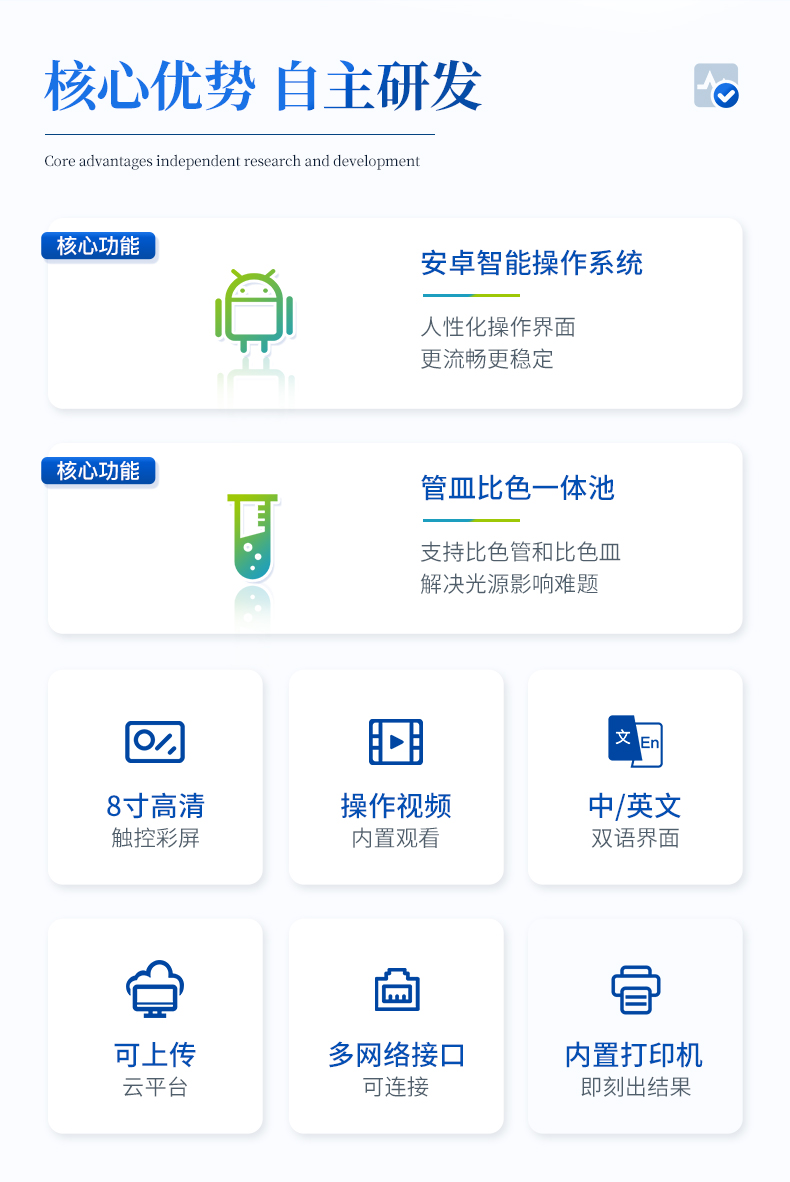 | 采用全新安卓7.1.1智能系統(tǒng),人性化中文操作界面,運轉(zhuǎn)速度更快速,穩(wěn)定性更強。 | 8英寸液晶觸摸屏顯示,人性化中文操作界面,讀數(shù)直觀、簡單。 | 采用精密比色池設(shè)計,使用光源一致,可以解決由于光源誤差帶來的檢測結(jié)果誤差問題,檢測結(jié)果更加精準(zhǔn)。 | 光源采用進(jìn)口超高亮發(fā)光二極管,光源亮度可以自動調(diào)節(jié)與校準(zhǔn)。 | 支持10mm、30mm、50mm皿比色和φ16mm管比色等比色方式,多元選擇,確保測量的準(zhǔn)確性; | 具有無線通訊功能,支持WIFI、RJ45、手機熱點聯(lián)網(wǎng)傳輸,檢測數(shù)據(jù)亦可通過U盤導(dǎo)出; | 多功能樣品管理,可對樣品進(jìn)行中英文命名,方便樣品記錄和數(shù)據(jù)存儲; | 儀器可永久存儲800萬組數(shù)據(jù),為方便大量數(shù)據(jù)查找,可通過時間檢索,并隨意選擇分析; | 支持HDMI輸出,方便用戶培訓(xùn)、講解、及大屏展示。 | 儀器帶有監(jiān)管云平臺,數(shù)據(jù)可通過局域網(wǎng)和互聯(lián)網(wǎng)上傳,亦可對接上傳至環(huán)境監(jiān)管部門平臺。 | 內(nèi)置熱敏行式打印機,打印紙上的內(nèi)容可自由選擇(包括二維碼打印); | 交流220V,可選配6ah大容量充電鋰電池,方便戶外流動測試; | 后期產(chǎn)品固件可升級。 |