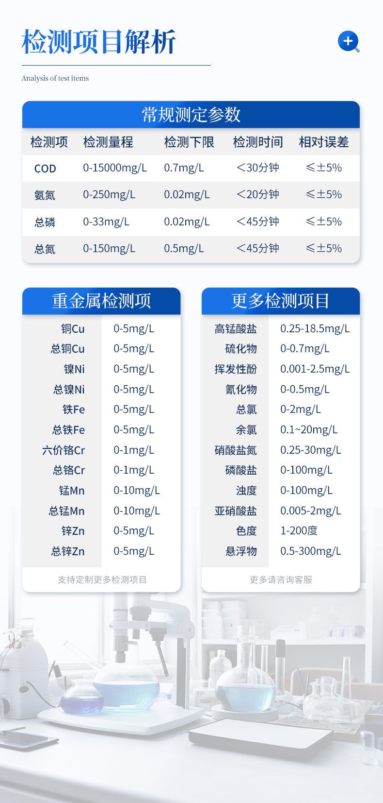| 波長配置:420nm、470nm、520nm、560nm、620nm、700nm; | 示值誤差:≤±5%; | 重復(fù)性:≤2% | 光化學(xué)穩(wěn)定性:20min內(nèi)數(shù)值漂移≤0.002A(10萬小時壽命); | 1、COD 依據(jù)標(biāo)準(zhǔn):HJ/T399-2007水質(zhì)化學(xué)需氧量快速檢測法 檢測量程:0-15000mg/L(分段) 檢測下限:0.7mg/L | 2、氨氮 依據(jù)標(biāo)準(zhǔn):HJ535-2009水質(zhì)氨氮的測定納什試劑分光光度法 檢測量程:0-250mg/L(分段) 檢測量程:0-250mg/L(分段) | 3、總磷 依據(jù)標(biāo)準(zhǔn):GB11893-89水質(zhì)總磷的測定鉬酸銨分光光度法 檢測量程:0-33mg/L(分段) 檢測下限:0.02mg/L | 4、總氮 依據(jù)標(biāo)準(zhǔn):EPA堿性過硫酸鉀分光光度法 檢測量程:0-150(分段) 檢測下限:0.5mg/L |