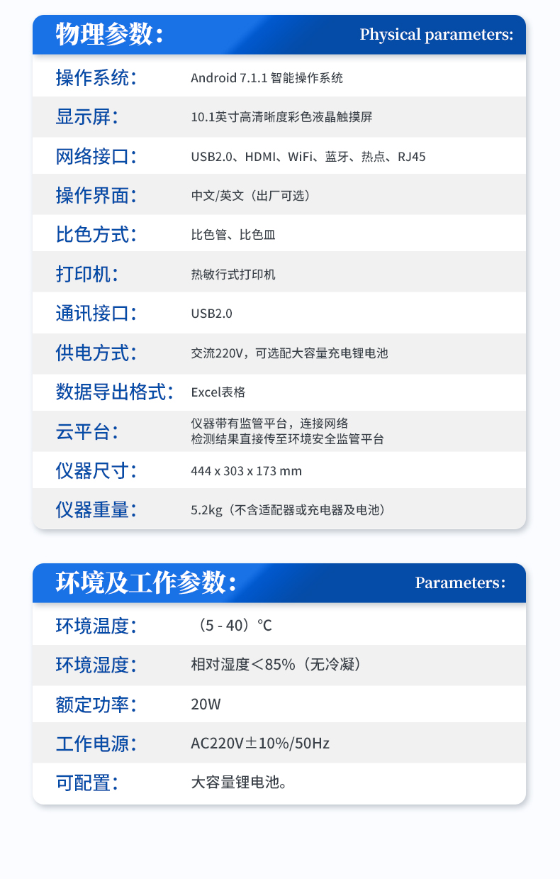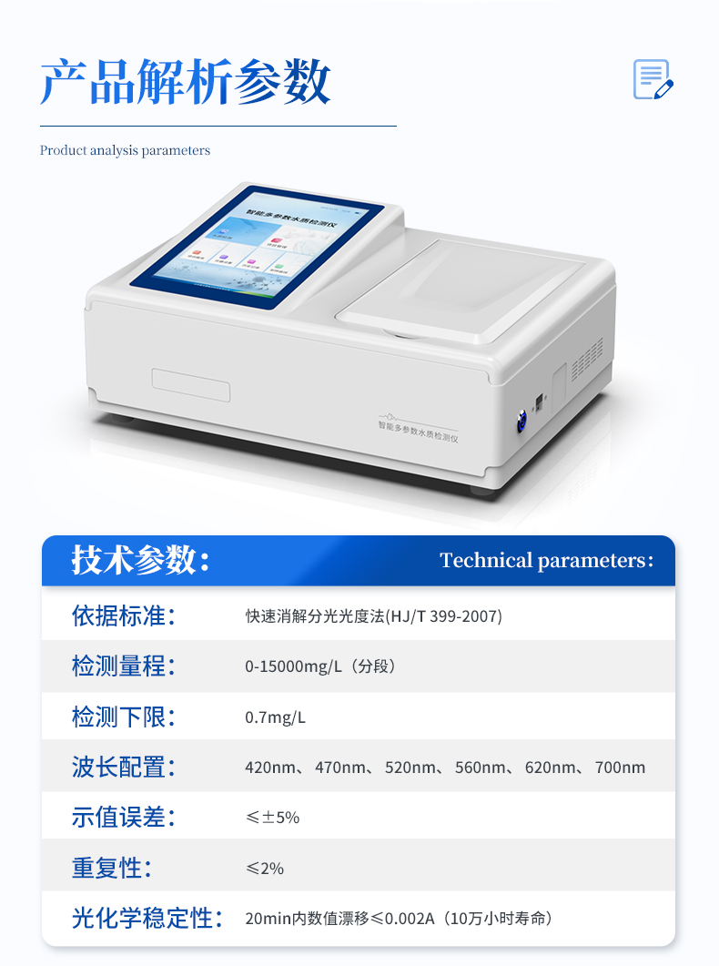 | 比色方式:比色管(16mm消解比色一體管)、比色皿(10mm、30mm、50mm); | 操作系統(tǒng):Android7.1.1智能操作系統(tǒng) | 操作界面:中文或英文操作界面; | 顯示屏:8英寸(1024*768分辨率)高清晰度彩色液晶觸摸屏; | 曲線數(shù)量:820條標(biāo)準(zhǔn)曲線、420條擬合曲線 | 網(wǎng)絡(luò)接口:USB2.0、HDMI、WiFi、藍(lán)牙、熱點、RJ45; | 云平臺:儀器帶有監(jiān)管平臺,連接有線/無線網(wǎng)絡(luò),檢測結(jié)果直接傳輸至環(huán)境安全監(jiān)管平臺。 | 打印機:熱敏行式打印機; | 數(shù)據(jù)儲存:800萬組,可自由調(diào)用查看; | 數(shù)據(jù)導(dǎo)出格式:Excel表格; | 儀器尺寸:367x243x125mm; | 儀器重量:5.3kg; |