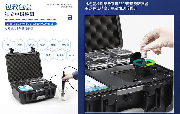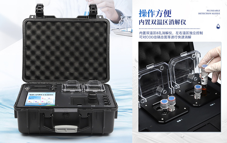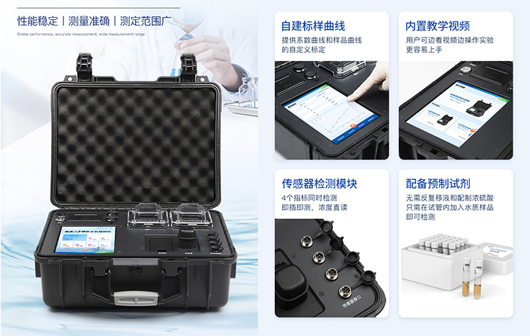 YT-B04型便攜式COD氨氮總磷總氮檢測儀采用高強(qiáng)度PVC工程塑料手提箱設(shè)計(jì),消解檢測一體式設(shè)計(jì),其中消解模塊具備雙溫區(qū)功能,檢測部分同時(shí)具備360°旋轉(zhuǎn)比色管檢測和比色皿檢測,安卓智能操作系統(tǒng),8英寸高清液晶觸摸屏,光纖檢測技術(shù),進(jìn)口光源,內(nèi)置大容量鋰電池,便攜多參數(shù)水質(zhì)檢測儀具有性能穩(wěn)定、測量準(zhǔn)確、測定范圍廣、功能強(qiáng)大、操作簡單等特點(diǎn)。