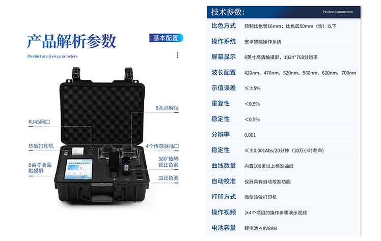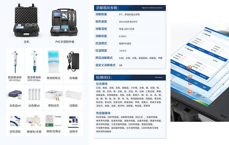 | 1、采用安卓智能系統(tǒng)7.1.1版本,更流暢的交互體驗(yàn),運(yùn)轉(zhuǎn)速度更快速,穩(wěn)定性更強(qiáng)。 | 2、雙比色檢測系統(tǒng),同時(shí)支持預(yù)制試管比色和比色皿比色; | 3、比色管檢測部分采用360°精密旋轉(zhuǎn)裝置,有效保證精度,穩(wěn)定性10倍提升。 | 4、內(nèi)置雙溫區(qū)8孔消解儀,左右溫區(qū)獨(dú)立控制,可對(duì)COD總磷總氮等進(jìn)行快速消解。 | 5、便攜一體式檢測設(shè)備,內(nèi)置大容量鋰電池,可一機(jī)實(shí)現(xiàn)戶外水樣消解、測定。 | 6、內(nèi)置熱敏打印機(jī),支持自動(dòng)、批量打印,可靈活選擇、編輯打印內(nèi)容,支持二維碼打印。 | 7、儀器具有WIFi無線、4G遠(yuǎn)傳和RJ45有線聯(lián)網(wǎng)功能,將數(shù)據(jù)上傳; | 8、配備霍爾德數(shù)據(jù)云平臺(tái),可接收儀器的檢測數(shù)據(jù),應(yīng)用于線上數(shù)據(jù)存儲(chǔ)、長短期動(dòng)態(tài)分析; | 9、用戶可自建標(biāo)樣曲線,提供系數(shù)曲線和樣品曲線的自定義標(biāo)定。 | 10、儀器內(nèi)置教學(xué)演示視頻,用戶可邊看視頻邊操作實(shí)驗(yàn),更容易上手。 | 11、檢測、消解可同時(shí)進(jìn)行,大大提**率。 | 12、可根據(jù)用戶要求定制檢測項(xiàng)目。 | 13、配備工廠預(yù)制試劑耗材,無需反復(fù)移液和配制濃硫酸,只需要在試管內(nèi)加入水質(zhì)樣品即可進(jìn)行檢測。 | 14、內(nèi)置人性化置頂功能,可將常測定指標(biāo)進(jìn)行置頂,置頂后顯示在項(xiàng)目列表*上方,無需每次繁瑣找取; |