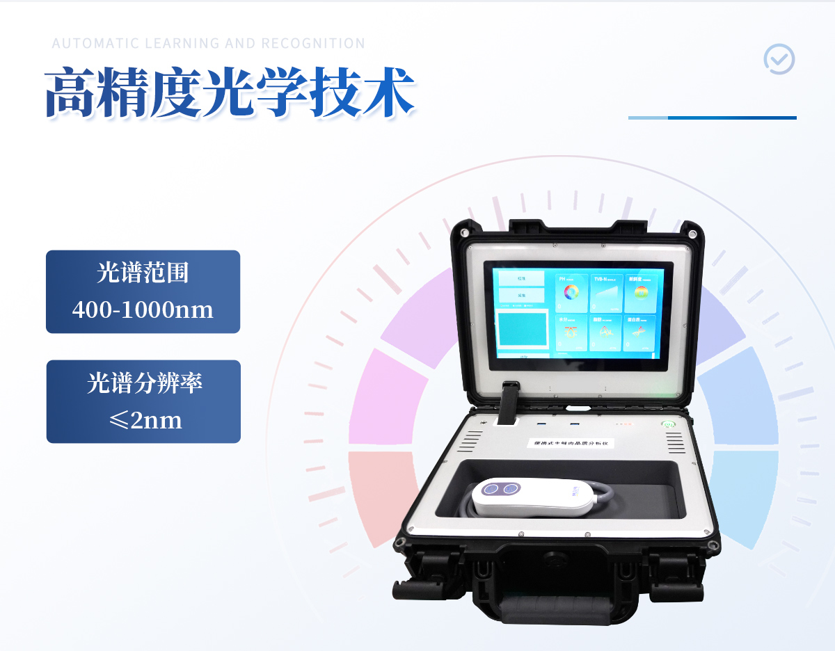 可用于檢測生鮮肉的蛋白質、脂肪、水分、pH、TVC、TVB-N、新鮮度、L*、A*、B*等品質參數。配備手提箱式防水減震外殼、大尺寸觸控屏幕并內置大容量電池,可一鍵自動校準,是一款適合移動作業(yè)場景的高精度生鮮肉品質檢測儀,其可用于生鮮肉及肉品生產、加工、儲運企業(yè)、肉品品質監(jiān)管部門等。