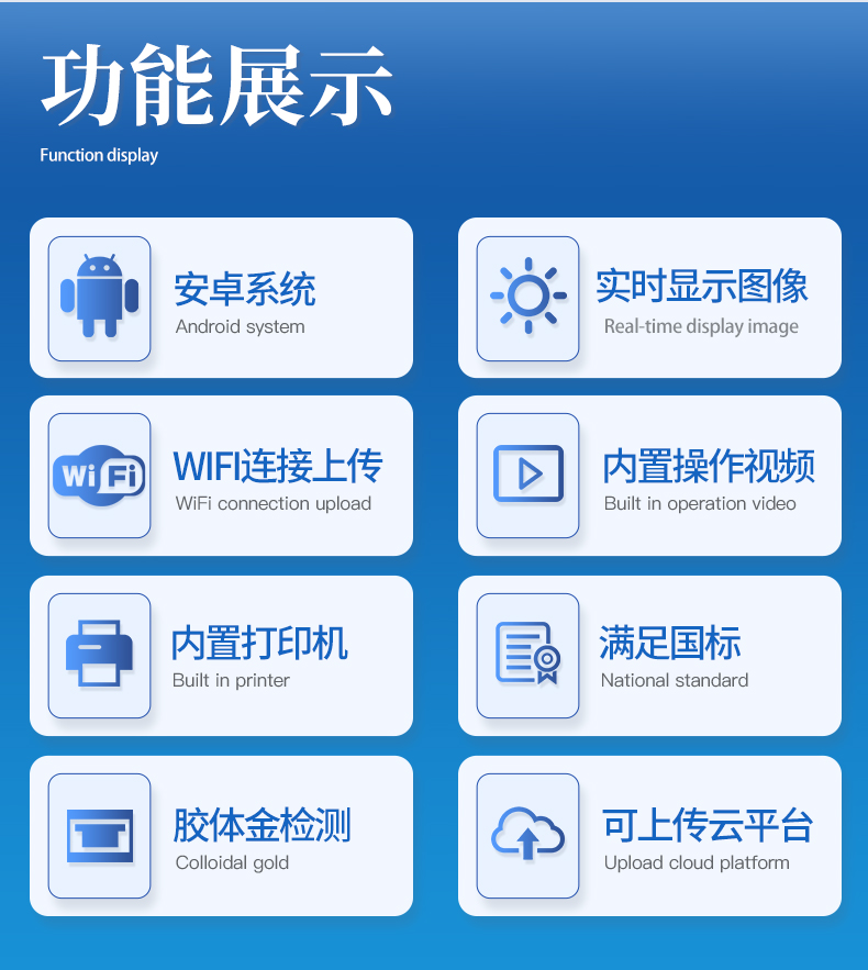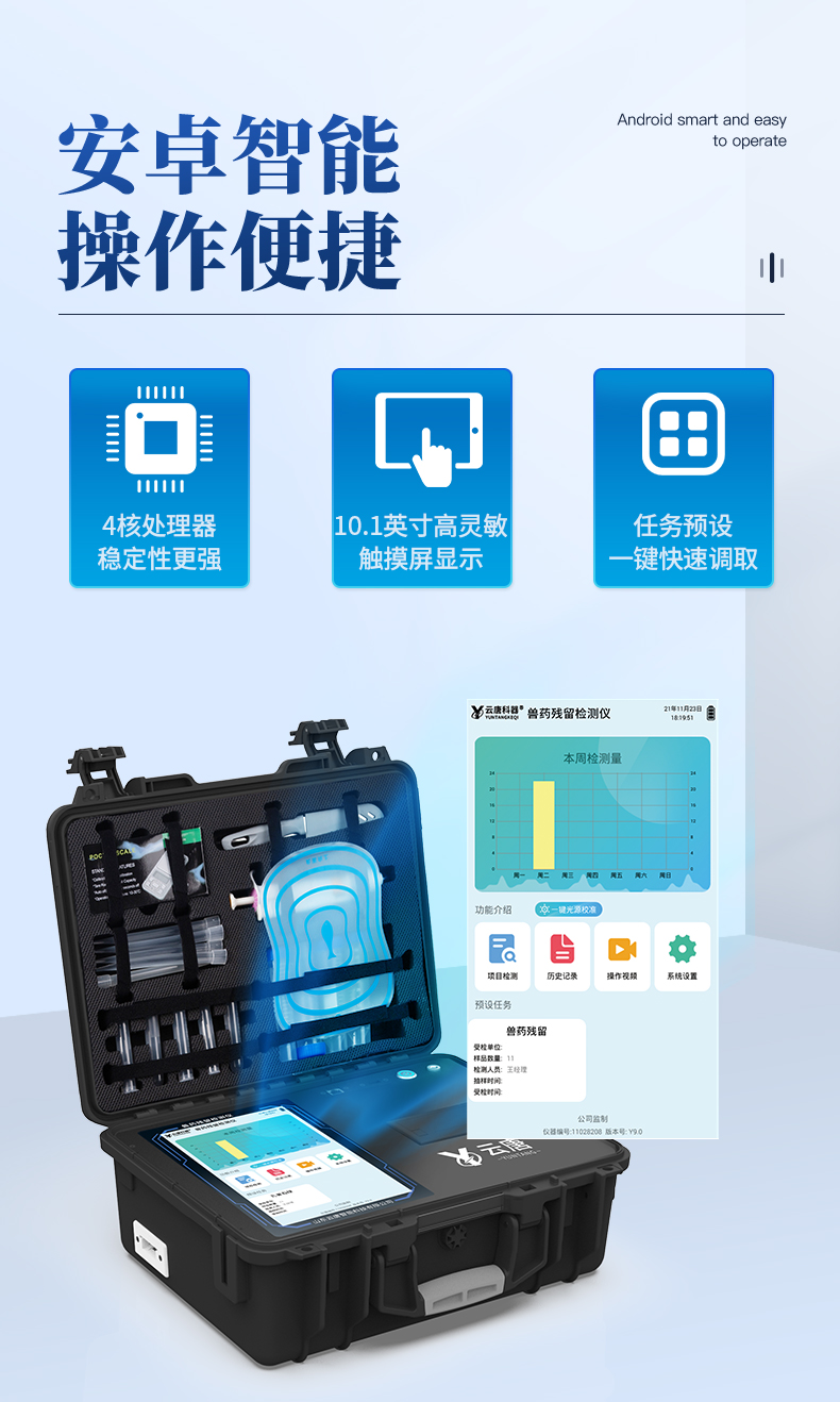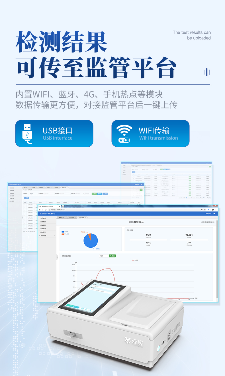 | 儀器采用手提式一體化系統檢測技術,將分光光度模塊、新型農殘檢測模塊、數字化管理模塊、無線通訊模塊高度集成于一體,支持檢測200種食品安全檢測項目,同時預留升級檢測方法。 | 儀器檢測模塊標準化、智能化,檢測項目可隨意自由組合。檢測箱體內置多個標準檢測單元,檢測模塊可以調整配置。 | 顯示屏幕:儀器采用10.1英寸豎向液晶觸摸屏顯,搭配運行安卓智能操作系統,主控芯片采用ARM Cortex-A7,RK3288/4核處理器,主頻1.88Ghz,操作方便,性能更強。 | 檢測通道:≥12通道;采用精密旋轉比色池設計,使用同芯片同光源校準精度,解決不同光源之間的誤差值,更加準確**。(1-12通道間誤差0.1%,***:ZL202022821055.2) | 儀器光源:高精度進口四波長冷光源,每個通道均配置 410、520、590、630nm 波長光源,標配**的光路切換裝置,專利光路切換功能可實現64波長,并且所有檢測項目可實現所有通道同時檢測。 | 設備可一鍵校準,自動保存校準數據,自動對比校驗,得到精準光源,采用Android SP存儲數據,光源數據永不丟失,方便每一次使用。 | 通訊接口:配備無線通信模塊、4G(APN)通訊模塊、藍牙傳輸,同時具有雙USB接口以及RJ45網線接口,可以多方式實現數據保存及數據傳輸 | 存儲方式:支持U盤存儲,標準USB接口,免驅動安裝。檢測結果存儲容量20萬條以上,可生成Excel表格進行拷貝,并具有登錄保護功能。 | 智能化操作系統: | 1)操作系統:儀器可在同一檢測界面自動對應相關檢測通道,一次性選擇1-12個樣品名稱,無需退出界面,節省操作時間。并可以對每個通道屬性和樣品信息單獨進行編輯,例如送檢單位、人員,檢測人員等,打印時勾選打印顯示。 | 2)數據集成系統:設備首頁自動匯總分析檢測數據,包含:周檢測數據、月檢測數據,全部檢測總數量,均包含檢測總數,合格數,不合格數,以及相關柱形分析圖,各項檢測數據一目了然,無需電腦查詢,更加快捷直觀。 | 3)數據庫系統:十幾項數據庫分類管理儀器:包含項目類型、項目數據、檢測數據、歷史記錄、國標信息、曲線信息、采樣信息、檢測信息、受檢信息、復核信息、圖表信息、光源校準信息、打印樣式信息、樣品庫信息等等,數據庫之間互相協調聯動保證數據的真實完整性。同時產品數據庫以及歷史檢測記錄支持一鍵檢索功能。 | 4)限量規判系統:具有限量查詢、添加物質合規判定系統。檢測出結果后,系統自動調用系統數據庫中相關國標進行比對判定,客觀顯示判定結果是否合格。 | 5)項目預設系統:儀器具有任務預設模塊,一鍵提前預設,給出方便快捷的新檢測方案,每一個任務分別可以設置不同的樣品、批次、編號、來源、備注、抽樣信息、檢測信息、受檢信息、復核信息等更多信息。樣品送檢時一鍵調取保存信息,并可多次調取,大大提高檢測效率。 | 6)數據監管系統:同步對接監管平臺,數據可局域網和互聯網數據上傳,檢測結果可選擇直接傳至食品安全監管平臺。進行區域食品安全監管及大數據分析處理與數據統計,檢測區域食品安全長短期動態,達到食品安全問題預估、預警。 | 7)打印系統:內置全新打印機,新創自定義打印方式,可按需靈活勾選控制:產品合格證(國家農業部標準要求),二維碼,抽樣信息、檢測信息,受檢信息、復核信息、抽樣日期、檢測日期等信息的打印。 | 供電模式:儀器交直流兩用,直流12V供電,可連接車載電源,可配6ah大容量充電鋰電池,電量可實時顯示,方便戶外流動測試。 | 膠體金檢測模塊:采用雙通道CMOS成像處理技術及膠體金免疫層析技術,可同時讀取雙膠體金卡數據,自動采集、處理分析,將檢測結果顯示,并可根據參考限值自動判斷檢測結果,可檢測常見的獸藥殘留、生物毒素、抗生素、違禁添加物等。 | 1)探測技術:CMOS成像探測; | 2)檢測通道:1個通道; | 3)檢測方式:消線法和比色法; | 4)顯示模式:陰性或陽性; | 5)曲線形式:軌道式掃描方式,顯示金標卡圖像,實時生成、識別CT曲線圖,無需手動調整,完成檢測后自動退出檢測卡。兼容市場上其他金標卡,使用耗材不受限制。 | 儀器加入遠程升級功能,可定向分客戶分儀器更新,開機后自動更新,客戶無需任何操作,即可升級全新項目。做到了無需退換機器即可實現實時遠程升級檢測儀器。 |