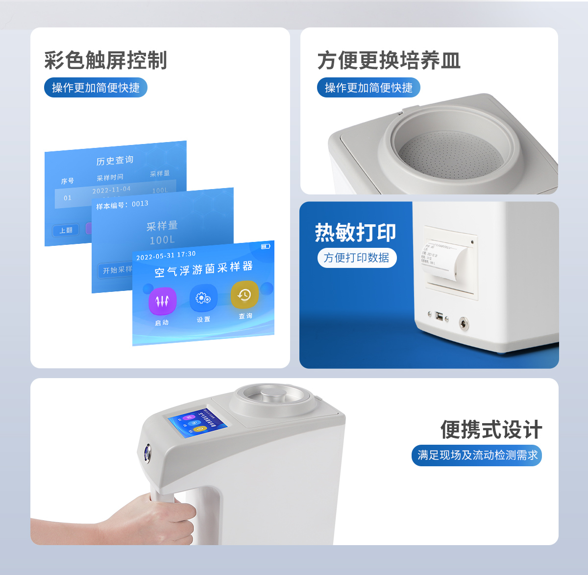 ●新型手持式外觀,美觀大方,使用方便。 ●彩色觸屏控制,操作更加**快捷。 ●LCD顯示采樣量,采樣時間等參數。 ●可將采樣量,采樣時間等參數按組儲存。 ●更換培養皿簡便,拿下采樣口即可更換培養皿。 ●帶熱敏打印機,方便打印數據。 ●帶上位機軟件,數據可導出電腦,方便歷史分析。 ●交直流兩用,內置6000mAh大容量鋰電池,可連續采樣8小時。 ●程序支持中文或英文。