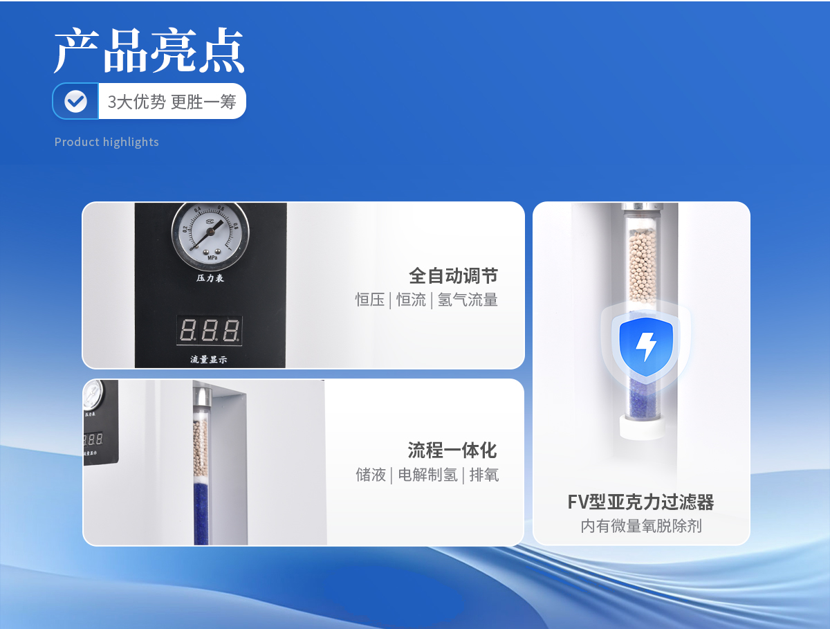 1、壓力、流量自動顯示,自動恒壓、恒流、氫氣流量可根據用量實現全自動調節。 2、FV型亞克力過濾器,內有微量氧脫除劑(不需要活化),氫氣純度更高;儀器內部采用硅橡膠圈(含硫量低),有效提高氣體質量,保證色譜基線平穩。 3、儲液、電解制氫、排氧一體化,池溫低,壽命長久。 4、配有安全裝置,靈敏可靠,自動防返堿。