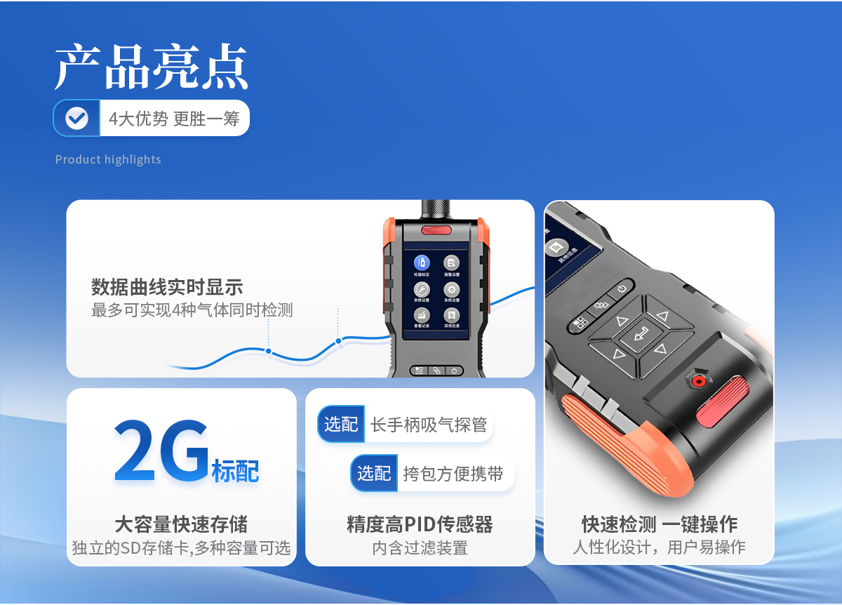 1、快速** 采用原裝進口PID傳感器,精度高 儀器內含過濾裝置,**過濾油、水、粉塵等雜質 即使在*嚴苛的工業環境中,檢測結果依然可以信賴 2、人性化設計,用戶易操作 3.5寸高清彩屏,開機即可檢測 純硬件一鍵開關機, 減小電量消耗 選配長手柄吸氣探管 選配挎包方便隨身攜帶 “跑車”造型,美觀大方 3、功能全面 同時顯示實現數據和濃度曲線 配置高低速可調的氣泵 *多可實現4種氣體同時檢測 可選配外置藍牙打印機,檢測數據實現移動打印 可選配藍牙、ZIGBEE等多種無線通訊方式 支持多種氣體顯示單位任意切換,濃度值由系統自動換算 中英文自由切換顯示 大容量快速存儲功能,存儲空間可以定制 Micro-USB接口充電器,方便隨時充電 安卓手機通用數據線,方便連接電腦讀取歷史數據 可以在高溫、高濕、高粉塵環境氣體檢測(需配采樣探槍)