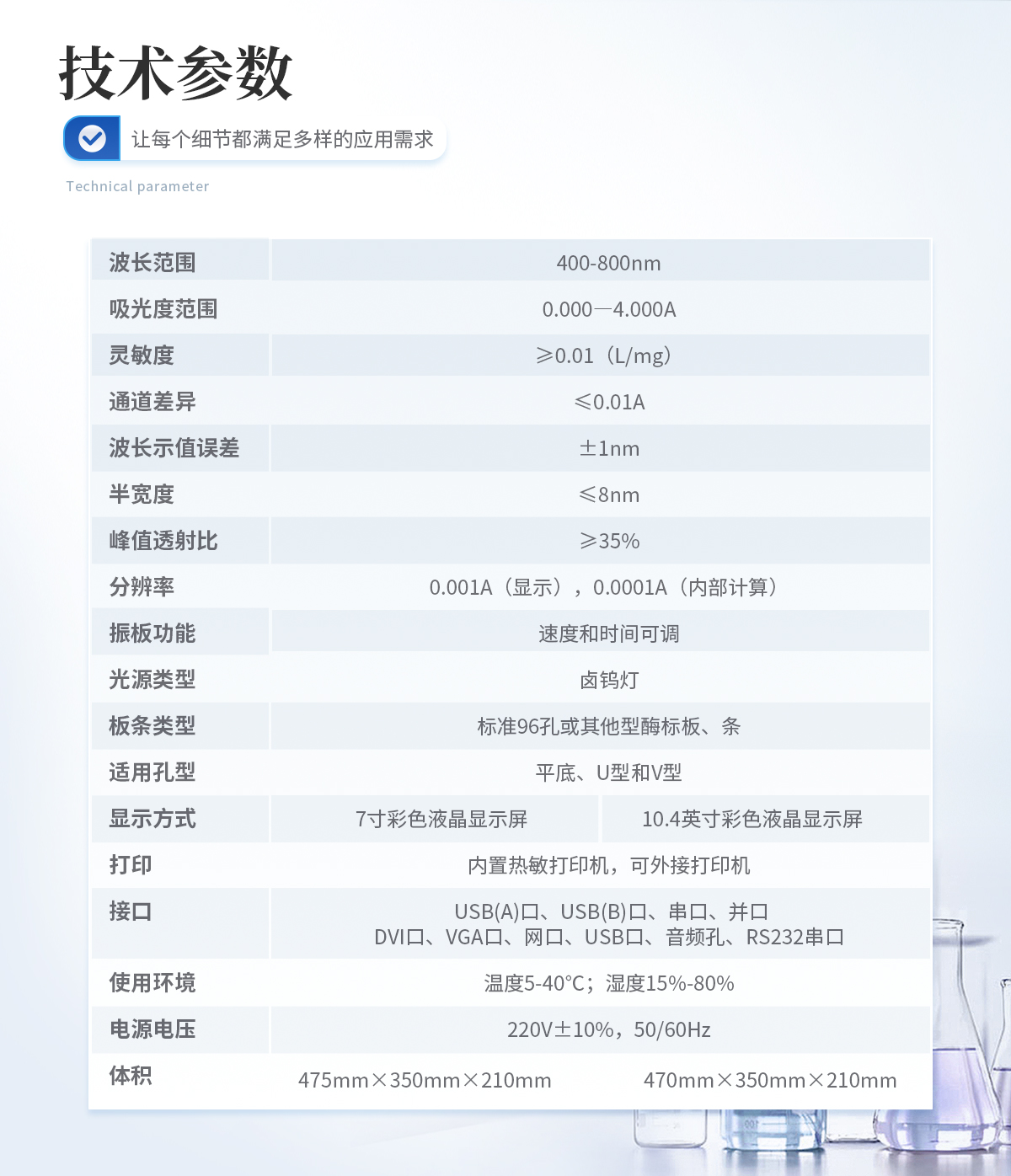 | *波長(zhǎng)范圍: 400-800nm | *濾光片配置:10個(gè)濾光片位置,標(biāo)配405nm、450nm、492nm、630nm,選配6定制波長(zhǎng) | 吸光度范圍:0.000―4.000A | *光通道數(shù):8通道光路檢測(cè),另設(shè)一個(gè)獨(dú)立參比通道(選配) | *示值穩(wěn)定性:≤±0.002A或≤0.5%T/10min。 | *示值誤差(準(zhǔn)確性):≤±0.005A或±0.2%T。 | *重復(fù)性:≤0.2%或≤0.2%T。 | 靈敏度:≥0.01(L/mg)。 | 通道差異:≤0.01A。 | 波長(zhǎng)示值誤差:±1nm | 半寬度:≤8nm | 峰值透射比:≥35% | 分辨率:0.001A(顯示),0.0001A(內(nèi)部計(jì)算) | *讀板速度:?jiǎn)尾ㄩL(zhǎng)≤3秒/96孔,雙波長(zhǎng)≤6秒/96孔 | 振板功能:速度和時(shí)間可調(diào) | 光源類型:鹵鎢燈 | 板條類型:標(biāo)準(zhǔn)96孔或其他型酶標(biāo)板、條 | 適用孔型:平底、U型和V型 | 顯示方式:7寸彩色液晶顯示屏顯示 | 輸入方式:觸摸屏輸入,可選配鼠標(biāo)和鍵盤(pán) | 打印:內(nèi)置熱敏打印機(jī),可外接打印機(jī) | 接 口: USB(A)口、USB(B)口、串口、并口 | *數(shù)據(jù)儲(chǔ)存:200,000個(gè)測(cè)試數(shù)據(jù),500個(gè)以上測(cè)試項(xiàng)目(可擴(kuò)展) | 使用環(huán)境:溫度5-40℃;濕度15%-80% | 電源電壓:220V±10%,50/60Hz | 體積:475mm×350mm×210mm(長(zhǎng)×寬×高) | 重量:11.5Kg |