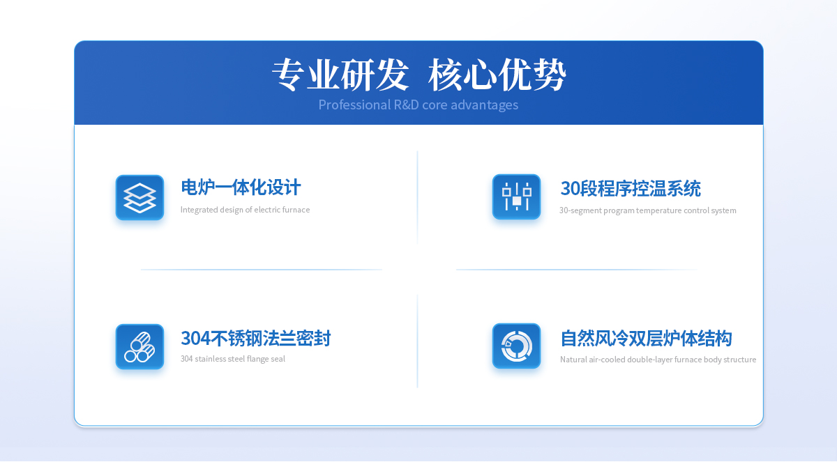 | 1、爐膛采用優質氧化鋁纖維材料,保溫性能好,耐用,拉伸強度高,無雜球,純度高,節能效果明顯; | 2、加熱元件采用優質HRE電阻絲,大大提高了其使用壽命; | 3、超溫報警,漏電保護,操作安全可靠。 |