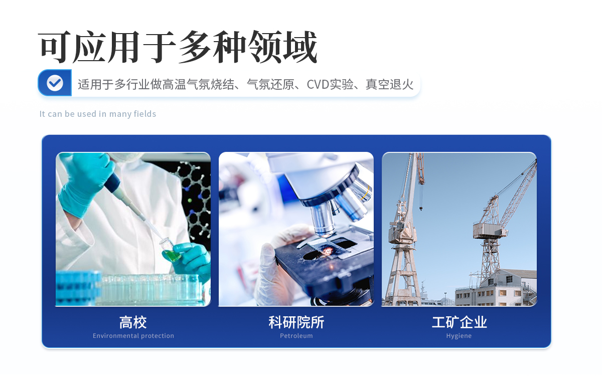 用于高校、科研院所、工礦企業做高溫氣氛燒結、氣氛還原、CVD實驗、真空退火等。具有溫場均勻、升降溫速率快、節能、可通入多重氣體等特點。