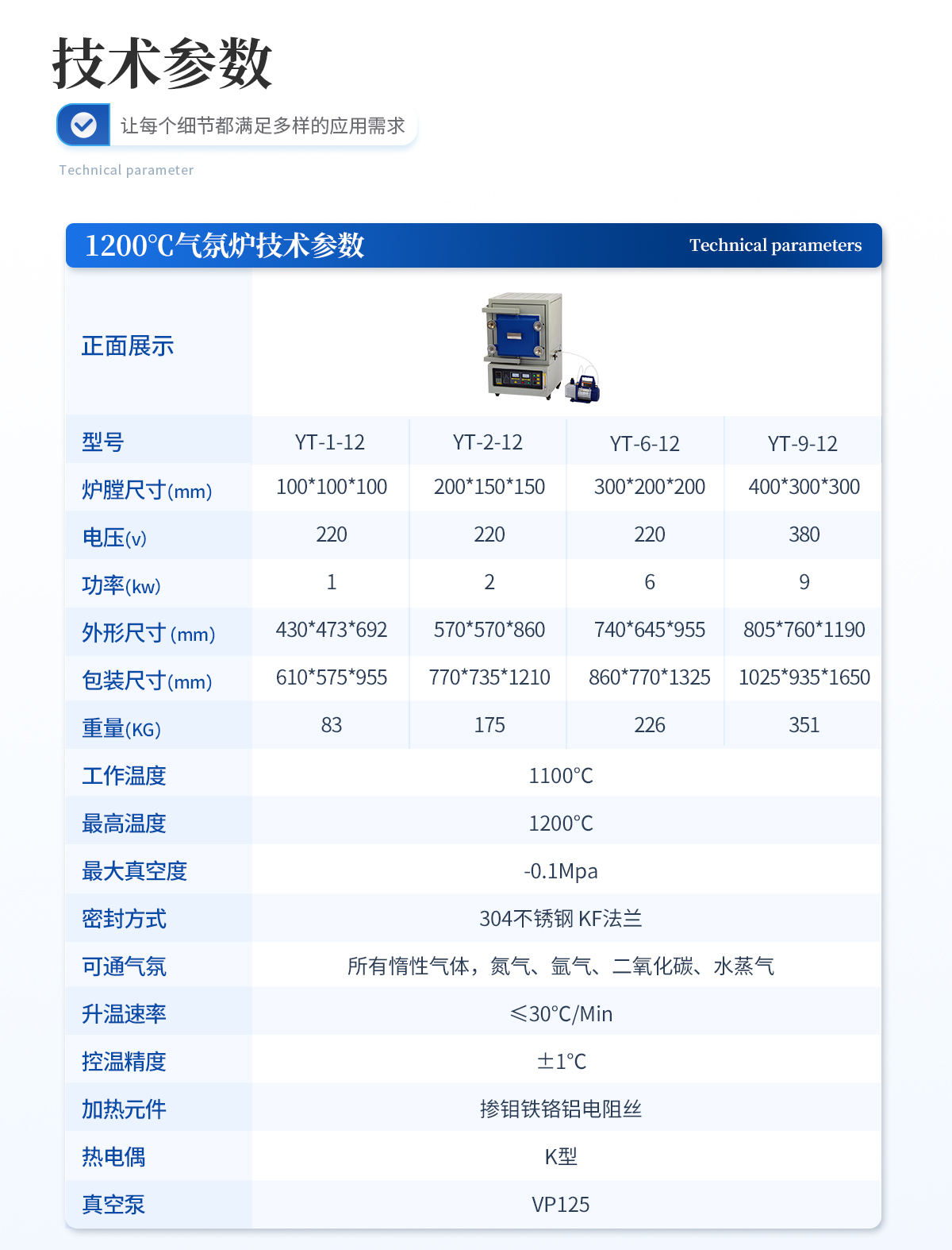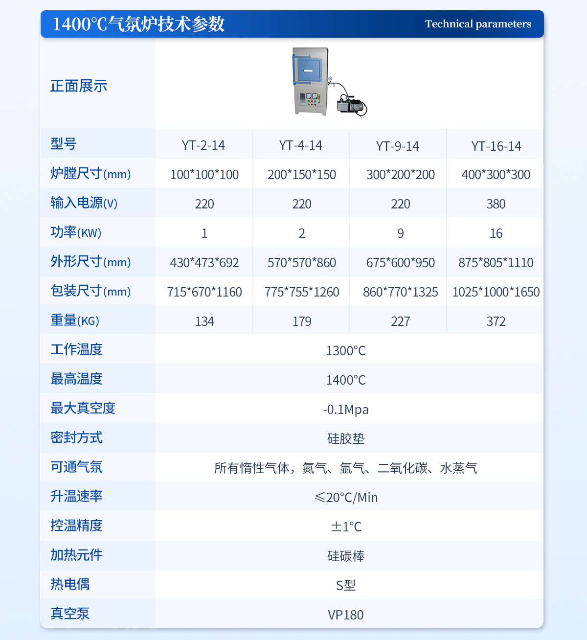 | 工作溫度:1300℃ | **溫度:1400℃ | **真空度:-0.1Mpa | 密封方式:硅膠墊 | 可通氣氛:所有惰性氣體,氮氣、氬氣、二氧化碳、水蒸氣 | 升溫速率:≤20℃/Min | 控溫精度:±1℃ | 加熱元件:硅碳棒 | 熱電偶:S型 | 工作電壓:220V 50HZ | 功率:1KW | 真空泵:VP180 |