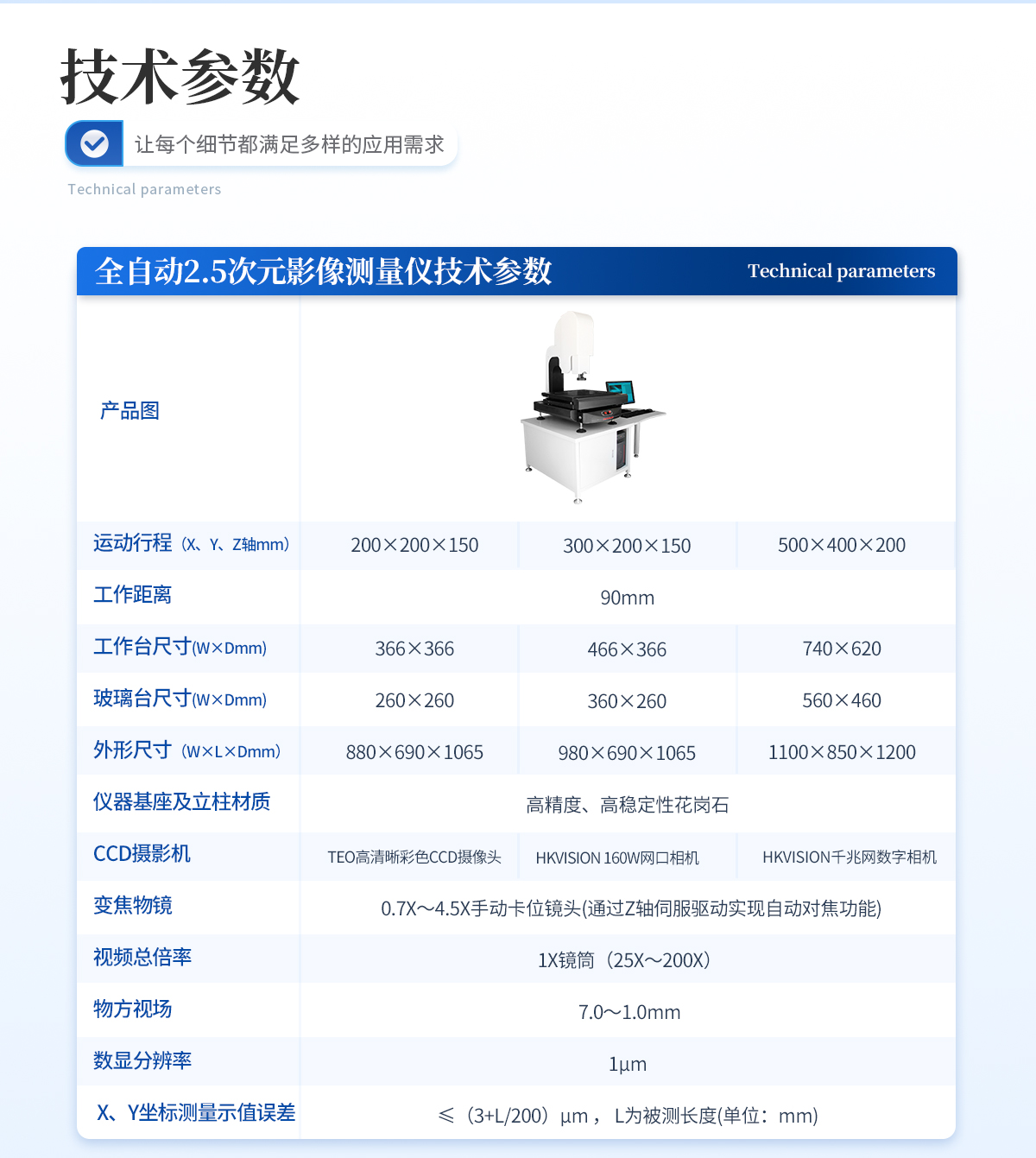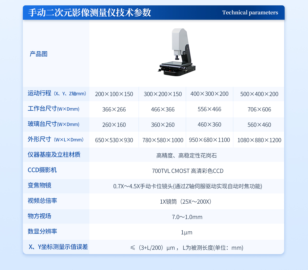 | 儀器基座 精磨高精度高穩定性硬質鑄鋁 1套 | CCD 700TVL模擬信號高清彩色CCD(COMST) 1個 | 鏡頭 0.7~4.5 X連續變焦鏡頭 1個 | 光柵尺 高精度位移傳感電子尺,分辨率:1μm (精微) 2條 | 導軌 咸陽藍博P級精密交叉導軌(LB) 3組 | 傳動 西德無牙光桿精密傳動(西德) 3條 | 表面光源 LED恒流環形驅動光源 (兩環一區) 1個 | 底光源 LED白色恒流底光源 1PCS | 數據采集卡 DC3000 1PCS | 視頻采集卡 視頻采集卡 1PCS | 影像測量軟件 DTV 2.5T手動影像測量軟件 1套 | 光學校正片 DTV 定制 1塊 | 電壓 AC :100-240V(全電壓) 1個 |