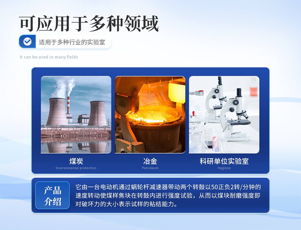 該儀器是測定煉焦用煤的粘結能力——羅加指數及粘結指數的專用儀器。適用于煤炭,冶金焦化部門及科研單位的實驗室專用。它由一臺電動機通過蝸輪桿減速器帶動兩個轉鼓以50正負2轉/分鐘的速度轉動,使煤樣焦塊在轉鼓內進行強度試驗,從而以煤塊耐磨強度——即對破壞力的大小表示試樣的粘結能力。