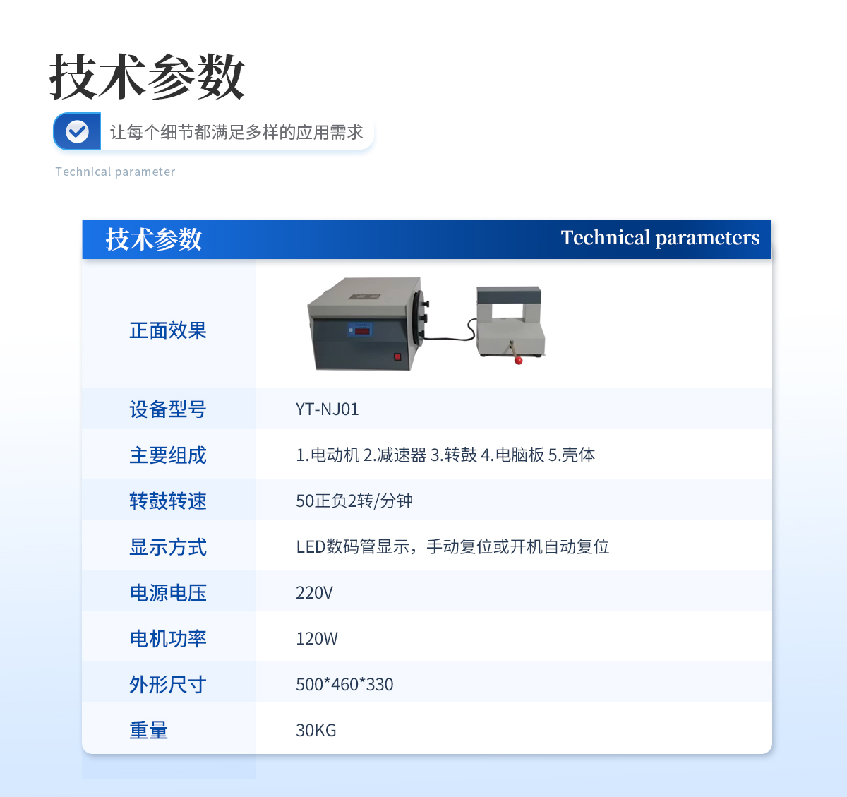 | 1.轉鼓轉速 50正負2轉/分鐘 | 2.顯示方式 LED數碼管顯示,手動復位或開機自動復位 | 3.電源電壓 220V | 4.電機功率 120W | 5.外形尺寸 500*460*330 | 6.重量 30KG |